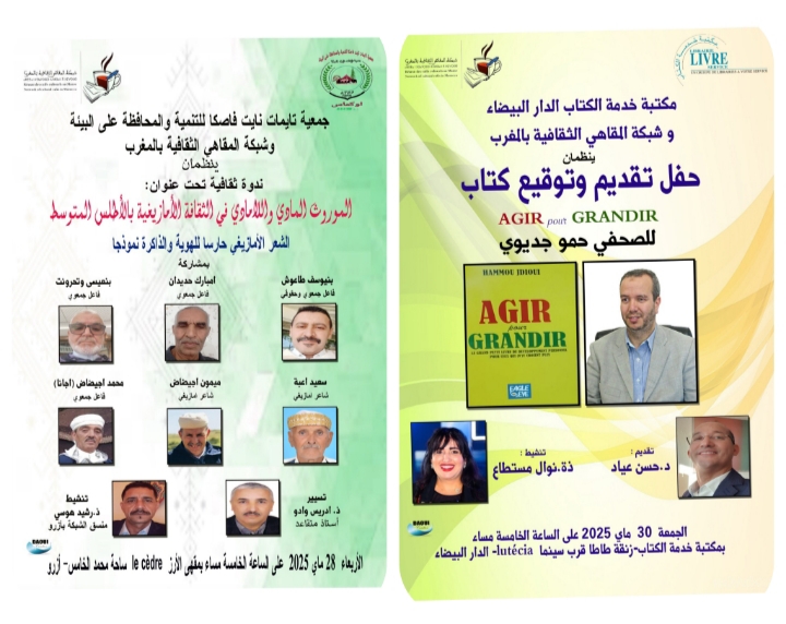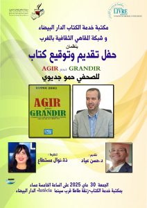 حفل تقديم وتوقيع كتاب “Agir pour Grandir ” للصحفي حمو جديوي بمكتبة خدمة الكتاب ، زنقة طاطا قرب سينما ” لوتيسيا ” بالدار البيضاء . هذا اللقاء يقدمه الدكتور حسن عياد ، وتنشطه الأستاذة نوال مستطاع إبتداء من الساعة الخامسة مساء .