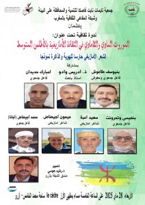 بتنسيق مع جمعية تايمات نايت فاصكا للتنمية والمحافظة على البيئة،تنظم الشبكة ندوة ثقافية تحت عنوان : الموروث المادي واللامادي في الثقافة الأمازيغية بالأطلس المتوسط ؛ الشعر الأمازيغي حارسا للهوية والذاكرة نموذجا ، وذلك بمشاركة الأساتذة والشعراء التالية أسماؤهم : بنيوسف طاعوش ،إدريس وادو ، امبارك حديدان ، بنعيسى وتحرونت ، سعيد أعبة ، ميمون أجيضاض و محمد أجيضاض (اجانا ) .