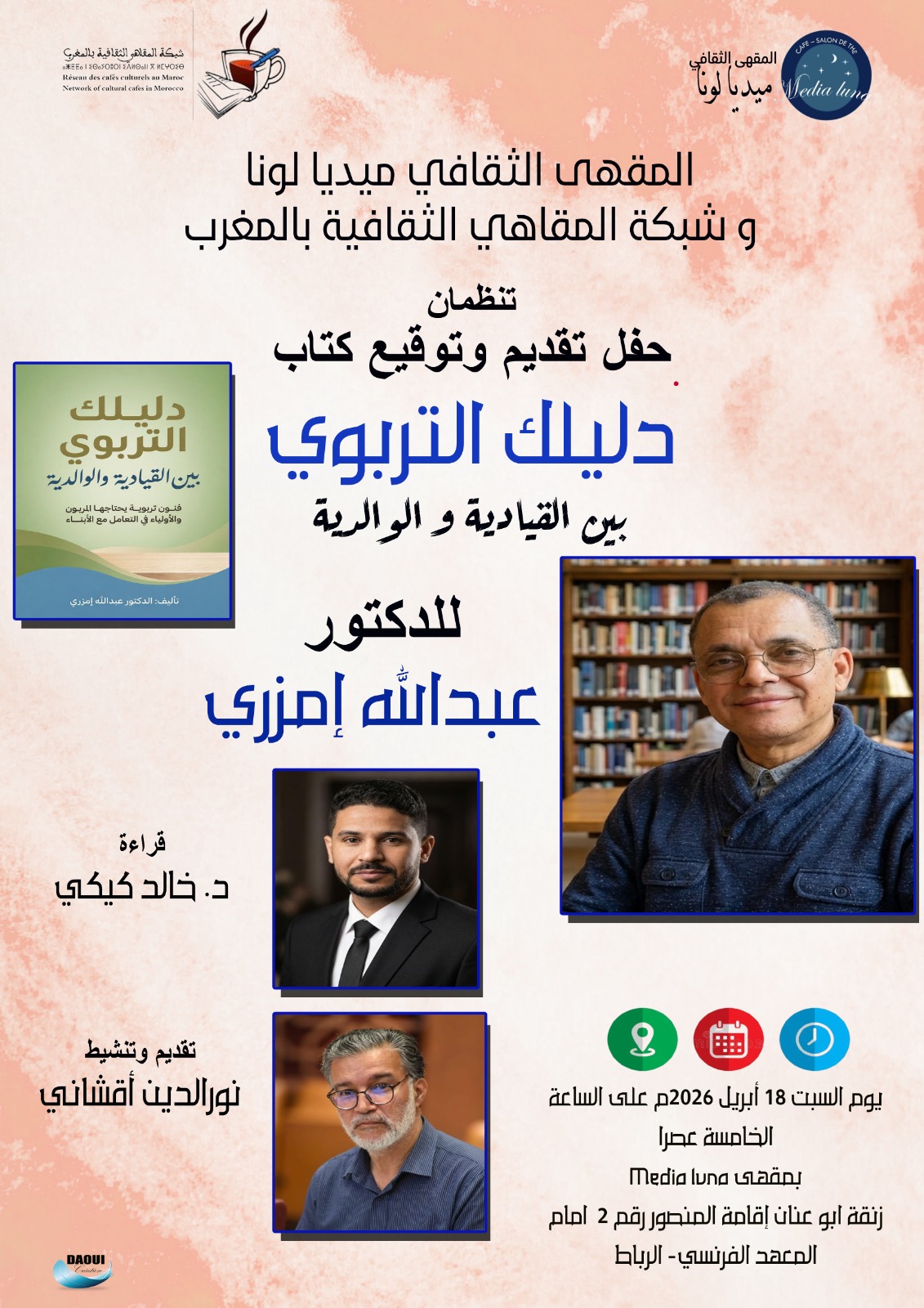 وفي سياق متصل، تحتضن الرباط يوم السبت 18 أبريل 2026، حفل تقديم وتوقيع كتاب “دليلك التربوي بين القيادية والوالدية” للدكتور عبد الله إمزري، وذلك بمقهى Media Luna ابتداءً من الساعة الخامسة مساء. وسيعرف هذا اللقاء قراءة في الكتاب يقدمها الدكتور خالد كيكي، فيما يتولى تنشيط الحفل الفاعل الثقافي نور الدين أقشاني.