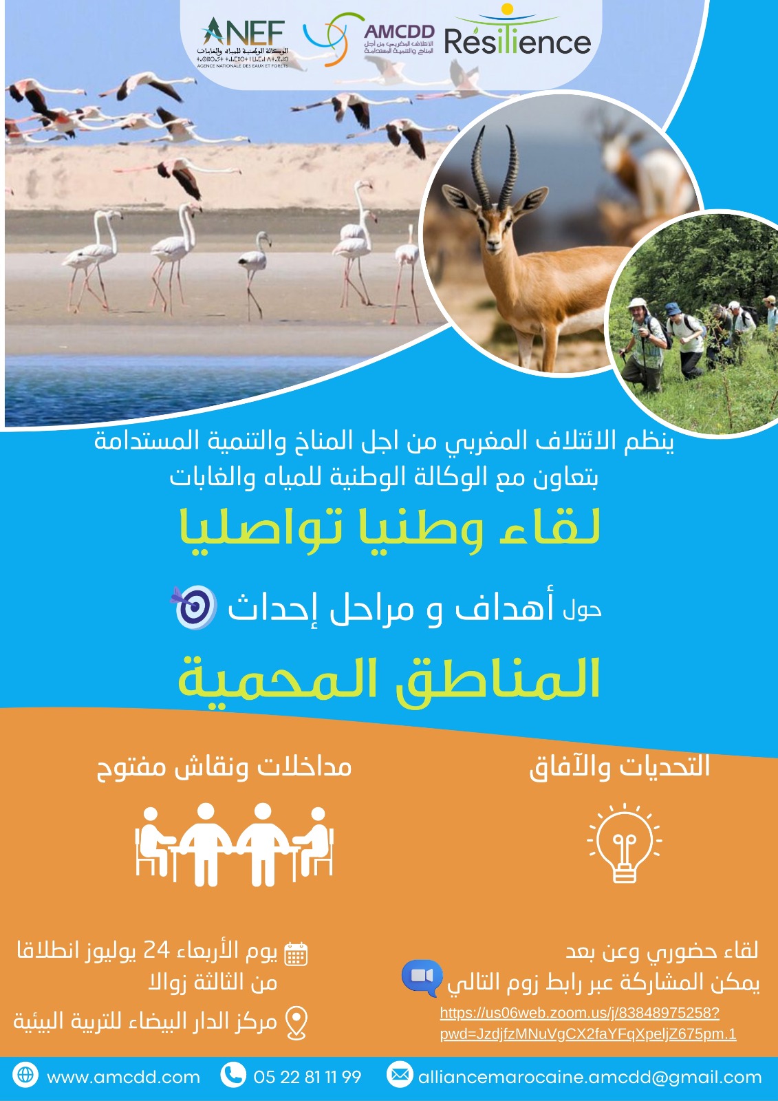 وفي هذا الإطار سيتم تنظيم لقاء وطني مفتوح عن بعد، يوم الأربعاء 24 يوليوز ابتداء من الساعة الثالثة إلى الساعة السادسة زوالا، بمشاركة المعنيين قصد التشاور وتعميق النقاش في الموضوع، والإجابة على عدد من التساؤلات المشروعة المتعلقة بالمقاربات المعتمدة حاليا قبل الإحداث وبعده، وتخوفات الساكنة من إجراءات تؤثر على معيشهم اليومي ومستقبلهم.