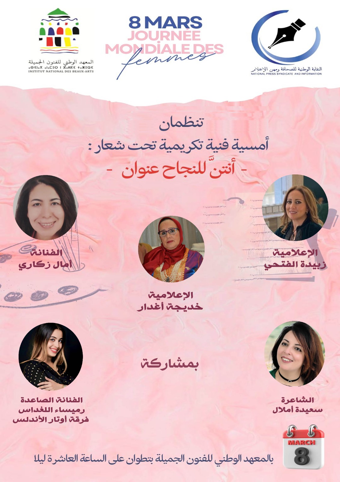 ينظم فرع النقابة الوطنية للصحافة ومهن الإعلام بتطوان، بشراكة مع المعهد الوطني للفنون الجميلة يوم السبت 8 مارس الجاري، أمسية فنية تكريمية لثلة من الأسماء النسائية المتألقة.