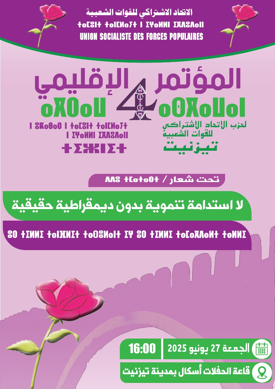 ينظم حزب الإتحاد الاشتراكي للقوات الشعبية بتيزنيت مؤتمره الإقليمي الرابع، يوم الجمعة 27 يونيو 2025، تحت شعار: ” لا استدامة تنموية بدون ديمقراطية حقيقية ”