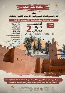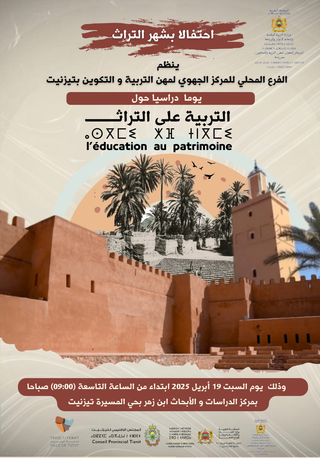 ينظم الفرع المحلي للمركز الجهوي لمهن التربية والتكوين بتيزنيت بشراكة مع المديرية الإقليمية للثقافة ، وبدعم من جماعة تيزنيت والمجلس الإقليمي لتيزنيت أيام دراسية حول التربية على التراث” ( انظر البرنامج رفقته) وذلك يومي الجمعة والسبت 18-19 ابريل 2025.