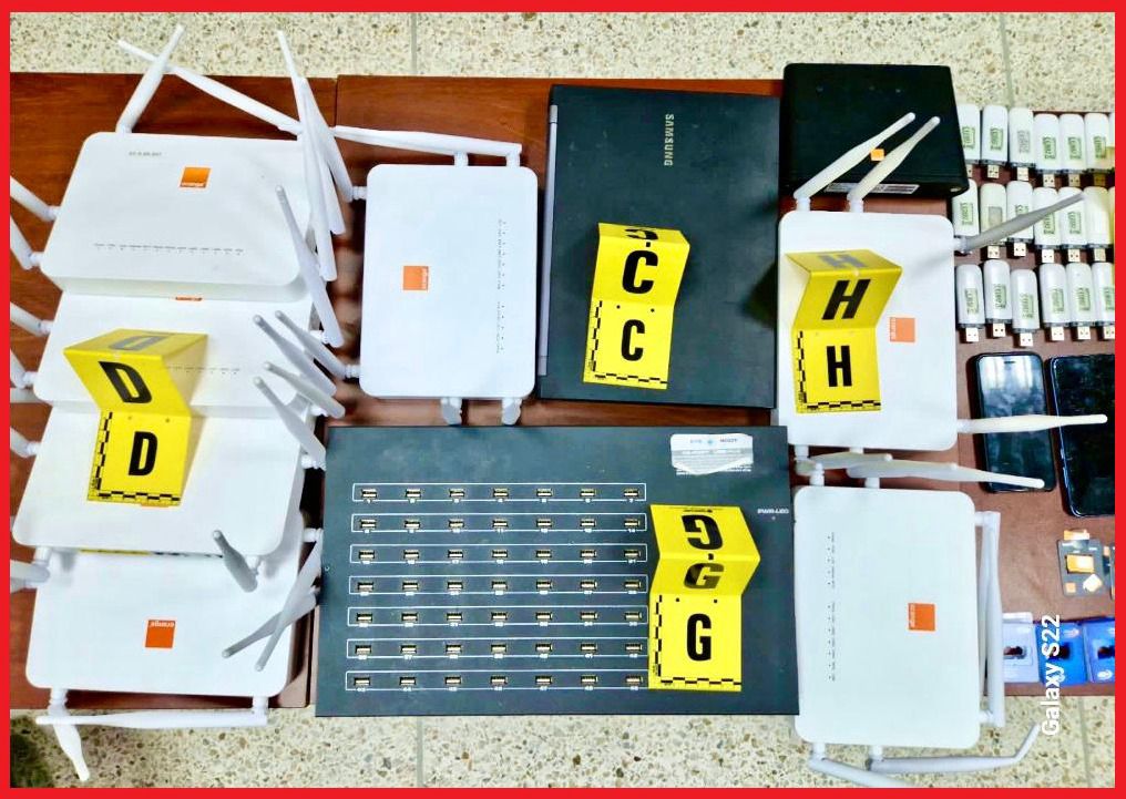 كما أسفرت عملية التفتيش المنجزة بداخل منزل المشتبه فيه عن حجز 471 شريحة هاتفية وطنية و58 بطاقة تعبئة، فضلا عن حاسوب محمول ووحدة مركزية للكمبيوتر و52 جهازا إلكترونيا ودعامات معلوماتية تستعمل في هذا النشاط الإجرامي.