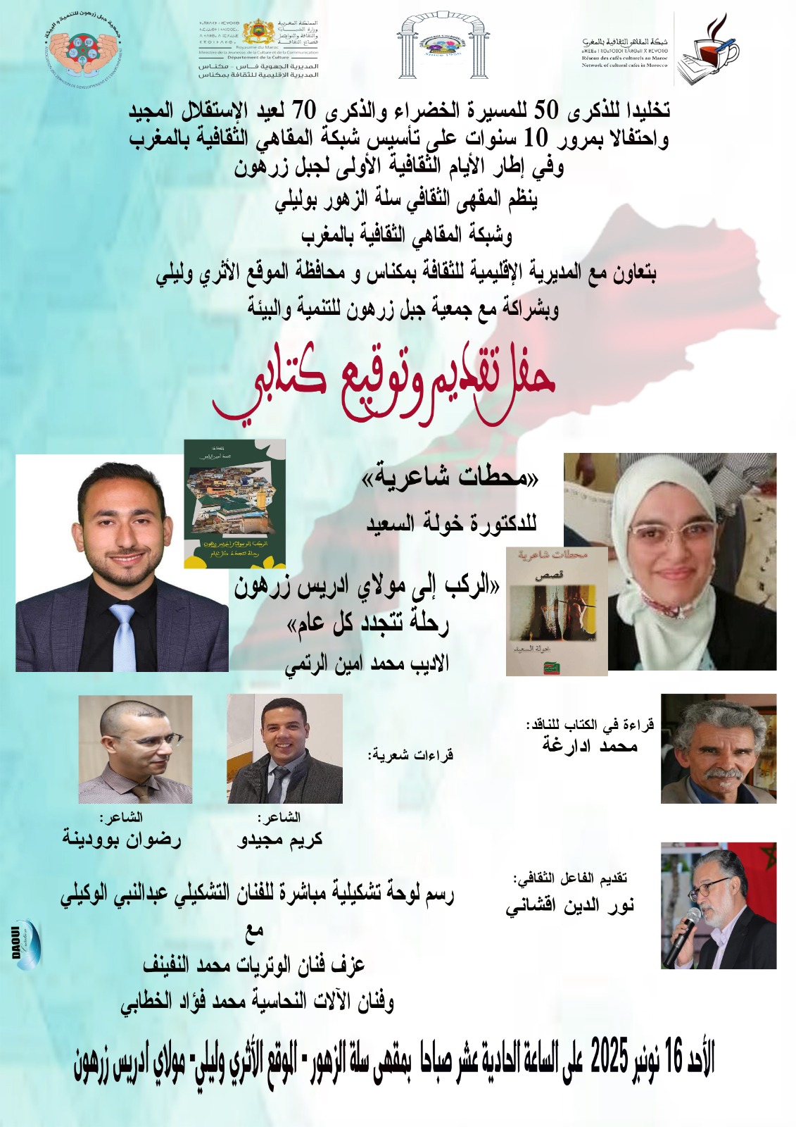 تخليدا للذكرى الخمسين للمسيرة الخضراء و الذكرى السبعين لعيد الإستقلال المجيد ،واحتفالا بمرور عشر سنوات على تأسيس شبكة المقاهي الثقافية ، ينظم المقهى الثقافي “سلة الزهور ” وشبكة المقاهي الثقافية بالمغرب الأيام الثقافية الأولى لجبل زرهون تحت شعار ” الفن في حضرة التراث ” ، وتتضمن معرض للفن التشكيلي و المنتجات المجالية بمشاركة الفنانون