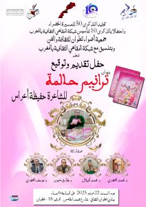 وبدورها تنظم جمعية أضواء تطوان للثقافة والفن ، بتنسيق مع الشبكة حفل تقديم وتوقيع ديوان ” ترانيم حالمة ” للشاعرة حفيظة أعراس ، وذلك يوم السبت 22نونبر 2025 بنادي تطوان الثقافي على الساعة السادسة مساء .