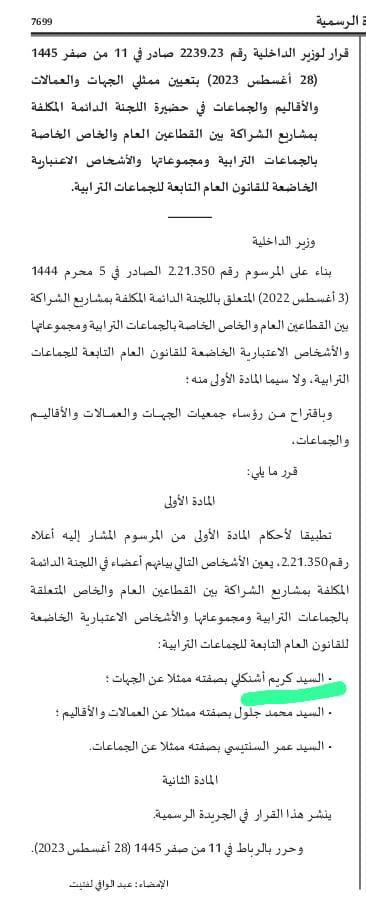 على صفحات الجريدة الرسمية عدد 7699 تم الإعلان عن تعيين رئيس جهة سوس ماسة السيد كريم اشنكلي عضوا باللجنة الدائمة المكلفة بمشاريع الشراكة بين القطاعين العام والخاص الخاصة بالجماعات الترابية ومجموعاتها والاشخاص الاعتبارية الخاضعة للقانون العام التابعة للجماعات الترابية.