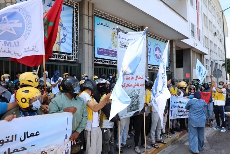عمال التوصيل بالمنصة الرقمية “گلوڤو” “GLOVO” يجسدون ملحمة نضالية اليوم الاثنين 21 يوليوز 2025 احتجاجا على محاربة الشركة للتنظيم النقابي وعلى حرمانها للعاملين بها من أدنى الحقوق المشروعة.